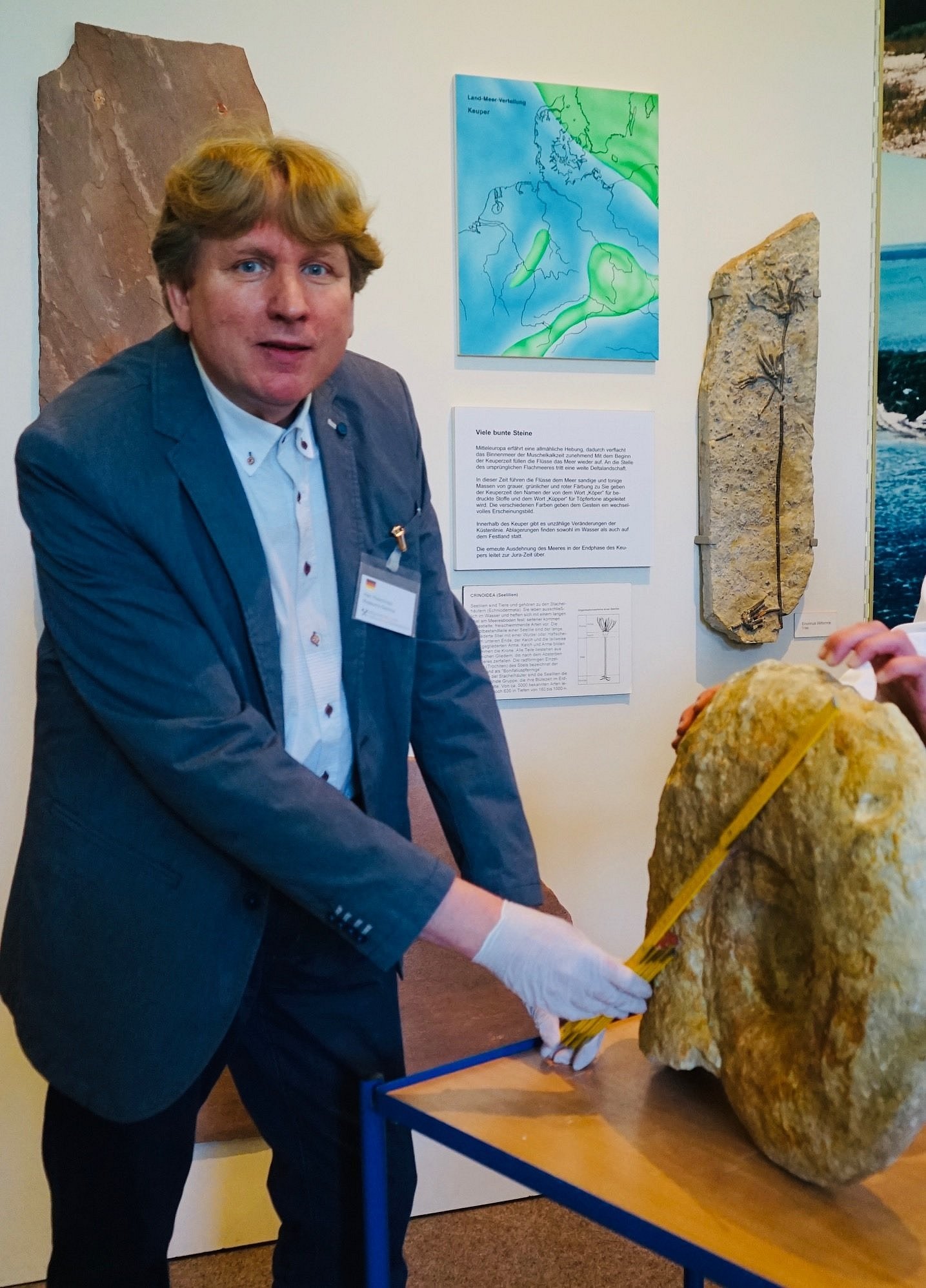 Für Gäste sind Besucher-Bergwerk und Museum vorübergehend geschlossen. Hinter den Kulissen aber wird gearbeitet. © Foto: Stefan Lyrath Porta Westfalica-Kleinenbremen (Ly). Mitarbeiter von Besucher-Bergwerk und Museum nutzen die Schließung während der Corona-Krise zu einer umfangreichen Bestandsaufnahme. Der Historiker Matthias Lorenz ist bei der Inventarisierung, die zurzeit intensiv vorangetrieben wird, auf ein bedeutendes Dokument gestoßen – das „Gutachten über das Eisenstein Districtfeld Wohlverwahrt“, 1883 verfasst von Karl Nottmeyer. Im selben Jahr war die Eizenerzgrube „Wohlverwahrt“ in Betrieb gegangen. Nottmeyer hatte damals einen Eisenanteil von 40 Prozent gemessen. „Hätte es deutlich weniger Eisenanteile im Erz gegeben, wäre es wohl nicht zu einer Förderung im größeren Umfang gekommen“, erklärt Diplom-Museologe Mirko Ignatz, der Geschäftsführer von Besucher-Bergwerk und Museum, die große Bedeutung des Gutachtens. „Auch der Verweis auf die gute Infrastruktur dürfte dies positiv beeinflusst haben.“Mike Polschinski mit einem Großammoniten aus der Sammlung von Reinhard Janssen. - © Foto: privat Die neuen Erkenntnisse zur regionalen Bergbaugeschichte sollen der Öffentlichkeit in einer Ausstellung präsentiert werden. Wann die Schau des Museums für Bergbau und Erdgeschichte eröffnet wird, steht noch nicht fest. „Wir befinden uns noch am Anfang des Projektes“, so Ignatz. Außerdem stehe noch nicht fest, wann der Museumsbetrieb wieder öffnen dürfe. Auch müssten die Ergebnisse der Inventarisierung erst abgewartet werden. Nottmeyers Gutachten umfasste die gesamten Eisenerzvorkommen von der „Roten Klippe“ bis zum Jakobsberg. „Das Gutachten hat eine wichtige Bedeutung für den Beginn der Eisenerzindustrie in Kleinenbremen“, betont Markus Miller, der wissenschaftliche Volontär des Hauses. „Die Vorkommen hier in der Region bildeten zu dieser Zeit sogar die zweitgrößte Lagerstätte für Eisenerz im Deutschen Reich nach Elsass-Lothringen.“ Gemeint sind Teile des Wesergebirges und der Wittekindsberg des Wiehengebirges. Vorbereitet wird in Kleinenbremen zurzeit auch eine neue Ausstellung zur regionalen Erdgeschichte. Breiten Raum dürfte in dieser Schau die Fossiliensammlung von Reinhard Janssen einnehmen. Nach dem Tode des Hausbergers hatte dessen Frau dem Museum 2008 die Steine als Schenkung übertragen. Um Fossilien kümmert sich im Museum Mike Polschinski, der Experte für Paläontologie und Erdgeschichte. Als einmaliges Exponat aus Janssens Sammlung stuft er einen etwa 80 Millionen Jahre alten Großammoniten aus der oberen Kreidezeit ein, entdeckt bei Straßenarbeiten in Dielingen (Gemeinde Stemwede). Heute ziert dieser Fund den Unterwasserraum der erdgeschichtlichen Abteilung. Er „belegt großflächige Überflutungen über lange geologische Zeiträume hinweg“, so Volontär Markus Miller. Ammoniten waren Meeresbewohner. Zu der Sammlung Janssens gehören Hunderte von Exponaten, vorrangig Ammoniten aus der Region. Sie erstreckt sich über Zeiträume der Tertiär-, Kreide-, Jura- und Triaszeit, aber auch des Erdaltertums. „Ein Schwerpunkt der Sammelleidenschaft von Herrn Janssen war es, die Stammesgeschichte der Ammoniten erlebbar zu machen“, erklärt Mirko Ignatz. Im Museum waren die Exponate bereits in Vitrinen zu sehen, geordnet nach Erdzeitaltern. Heute ist der Bestand eingelagert, nachdem 2014 ein Rückbau wegen Sicherheitsmängeln nötig geworden war. Reinhard Janssen habe das Verständnis der regionalen Geologie und Paläontologie über Jahrzehnte in der geologischen Arbeitsgemeinschaft Minden durch Öffentlichkeitsarbeit mitgeprägt, wie es in einer Pressemitteilung heißt. Dem Kleinenbremer Museum sei er als Teil des damaligen paläontologischen Freundeskreises eng verbunden gewesen. |
