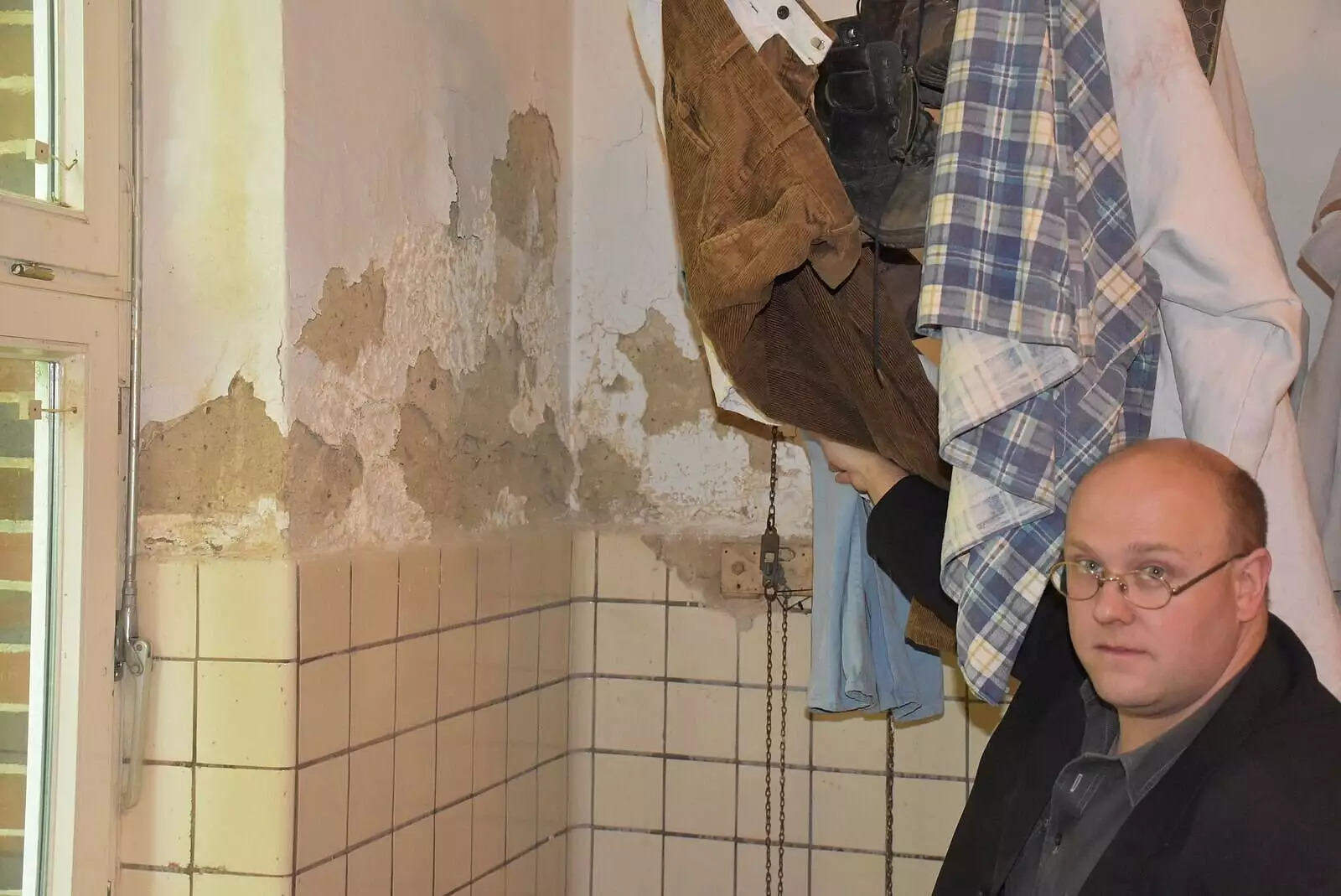 Feuchtigkeitsschäden tauchen an vielen Stellen des fast 90 Jahren alten Gebäudes auf. Auch die Kaue, der Umkleidebereich der Bergleute, ist davon betroffen. - © Dirk Haunhorst Auf dem Weg in den Heizungskeller weist Schmidt auf abblätternden Putz und fehlende Fliesen hin. Die Feuchtigkeit hat im Laufe der Jahrzehnte an etlichen Stellen des denkmalgeschützten Gebäudes Spuren hinterlassen. Das Wasser drückt von der Hangseite. Auch das ein Problem, das bei der Sanierung zu lösen ist. Und die alte Ölheizung, die in Kombination mit der fehlenden Dämmung die gesamte Immobile zur kostspieligen Energieschleuder macht, dürfte zugunsten von Wärmepumpe und Solartechnik bald ausgedient haben. Zuletzt sei in der kälteren Jahreszeit nur noch die untere Etage des Museumsgebäudes geheizt worden, berichtet Schmidt.